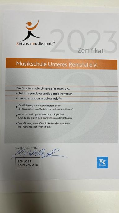 Im Rahmen eines Konzertes der Musikschule Unteres Remstal wurde heute in einer kleinen Zeremonie das Zertifikat „Gesunde Musikschule“ an die Musikschule Unteres Remstal verliehen. Wir sind sehr stolz darauf nun zum Kreise der mittlerweile über 70 Musikschulen bundesweit zu gehören, denen dieses Zertifikat verliehen wurde.
