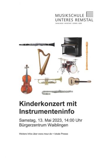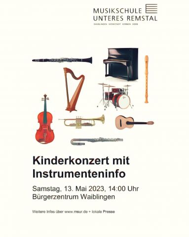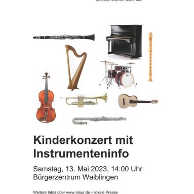 Das diesjährige Kinderkonzert der Musikschule Unteres Remstal findet am Samstag, den 13. Mai um 14:00 Uhr im Ghibellinensaal des Bürgerzentrums Waiblingen statt. Im Anschluss an das Konzert gibt es wieder eine Instrumenteninfo, bei der die Fachlehrer für Gespräch und Beratung bereitstehen. Der Eintritt ist frei.